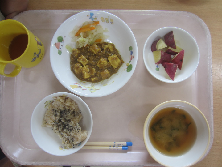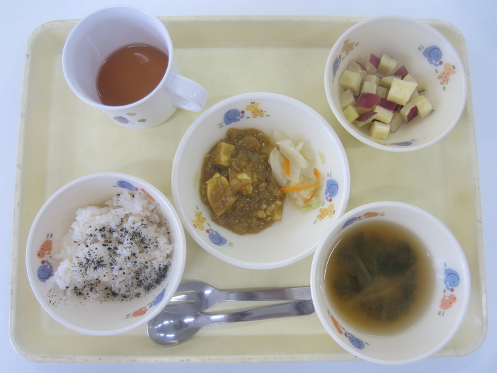 (豆腐のカレー煮) 麻婆豆腐のカレーバージョンです。園児が大好きなカレー味で美味しくいただけます。
