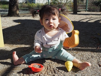 砂遊びも大好き!手に触れる砂の感触を楽しんでいるようです。