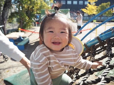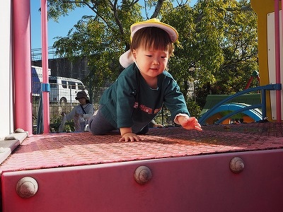 自分でも登れるよ!固定遊具の上の段にもどんどん登れるようになってきています。