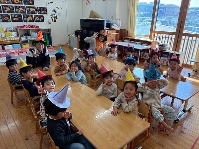 こすもすぐみさんとハロウィンパーティーをしました。帽子やマントを作ってホールへレッツゴー!