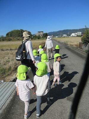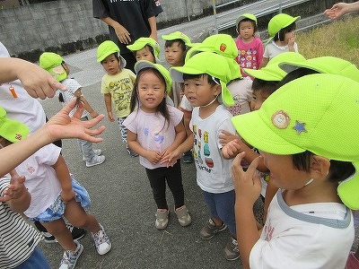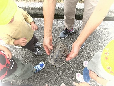 うさぎ・ぱんだぐみで一緒に近くの神社まで行きました。途中で、カメやカニに遭遇!興味津々で観察していました。
