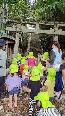 神社に到着。長ーい階段の先には、神様のお家!?ちょっとこわごわでも、みんなちゃんとご挨拶できました。