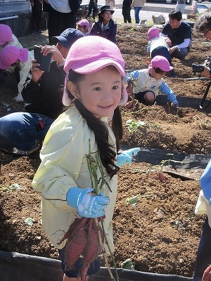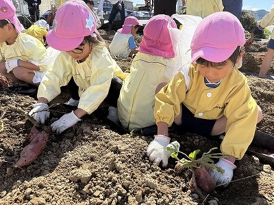 おいもほりでは「見て!でっかい!!」と言いながら大きなおいもに興奮したり「これはちびいもちゃんや♪」と丁寧に掘ったりとみんなでおいしいおいもをたくさん収穫しました!