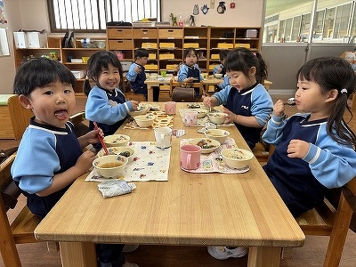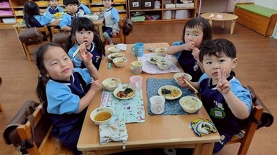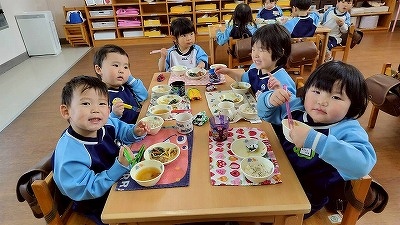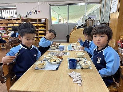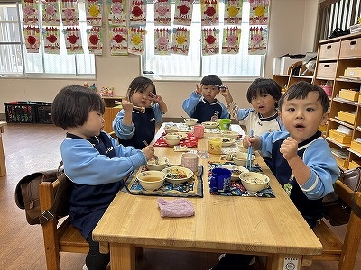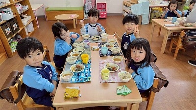 「お兄ちゃん、お姉ちゃんのお部屋ってテーブルもいすも大きい!」と子どもたち。最初はちょっぴり緊張していた子どもたちですが、パクパクごはんを食べていました。