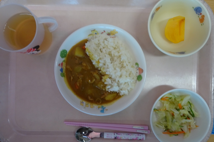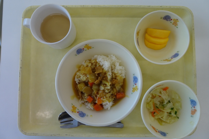 (ポークカレーライス) 園児から大人気のカレーライス、給食室から漂ってくるカレーの香りで「今日はカレーライスや」という声が聞こえてきます。