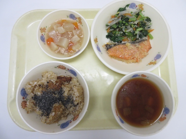 (小松菜のごま和え)鉄分が豊富な小松菜は、あともう一品欲しい時の小鉢にぴったりです。ごまを加えることで風味と旨味がより一層増します。ごまは生のままで使うと消化によくないですが、炒ったりすったりして使うことで、香りと消化吸収が良くなります。