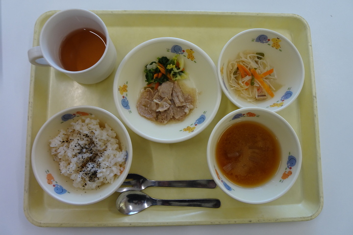 (チキンカレーライス) 本日は、人気メニューのカレーです。園で使用している神山鶏の特徴は、3つのゼロです。①抗生物質・抗菌剤ゼロ②遺伝子組み換えなし③収穫後農薬なし の安心食材です。