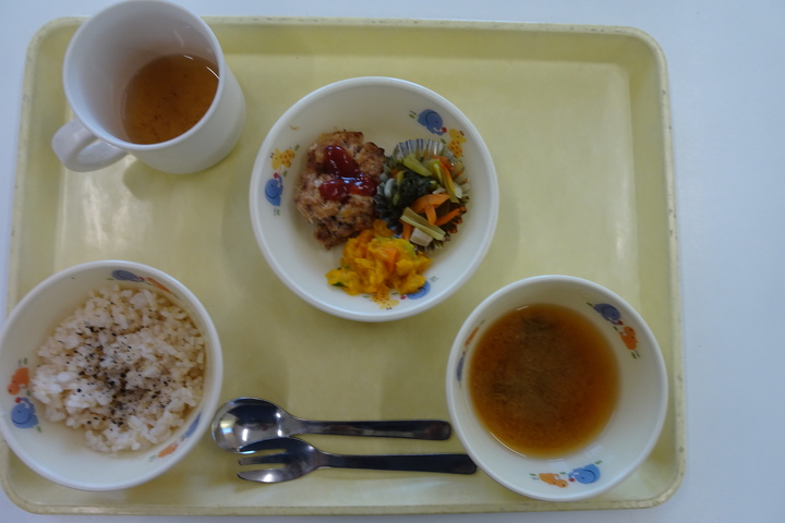 (鹿肉ハンバーグ) 本日は、普段なかなか味わうことの出来ない鹿肉を使用したハンバーグです。鹿肉は、牛肉や豚肉と比べ高たんぱく・低脂質で、エネルギーも低くヘルシーな食材です。鉄分も多く含んでいます。