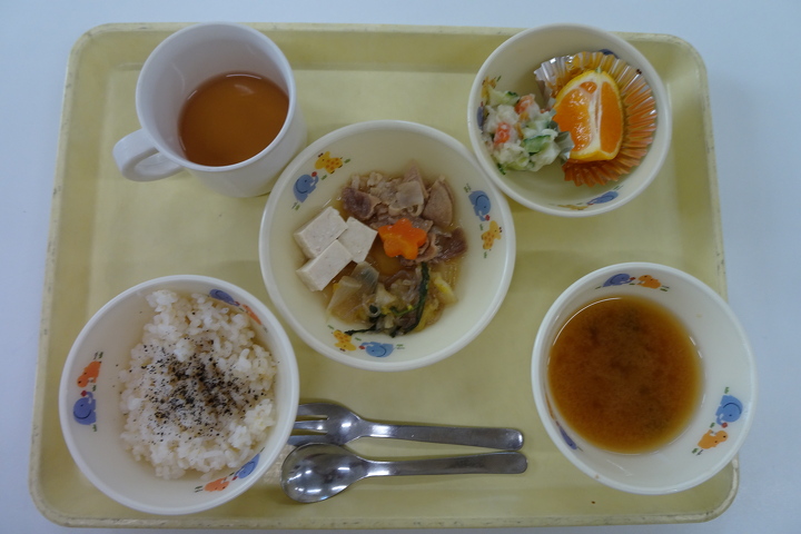 (チキンカレーライス) 本日は、人気メニューのカレーです。園で使用している神山鶏の特徴は、3つのゼロです。①抗生物質・抗菌剤ゼロ②遺伝子組み換えなし③収穫後農薬なし の安心食材です。