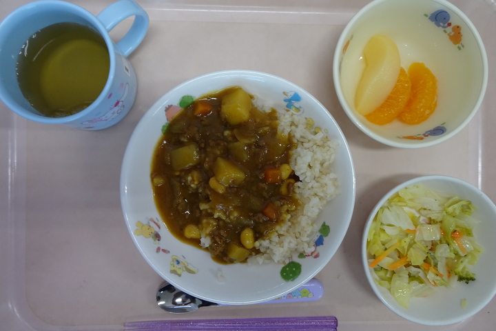 (ポークカレー) 本日は園児から大人気の、カレーライスです。給食室から漂ってくるカレーの香りで「今日はカレーライスや!」という声が聞こえてきます。