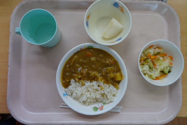 (ポークカレーライス) 園児から大人気のカレーライス、給食室から漂ってくるカレーの香りで「今日はカレーライスや」という声が聞こえてきます。