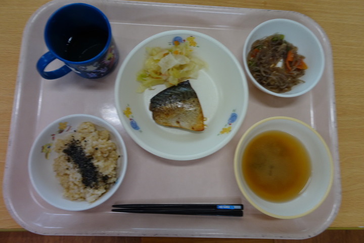 (魚の柚庵焼き・サバ) 青魚に含まれるEPA・DHAは、記憶力や学習能力の向上・視力の回復などの効果が期待できます。本日は、鯖を西京焼きにしました。