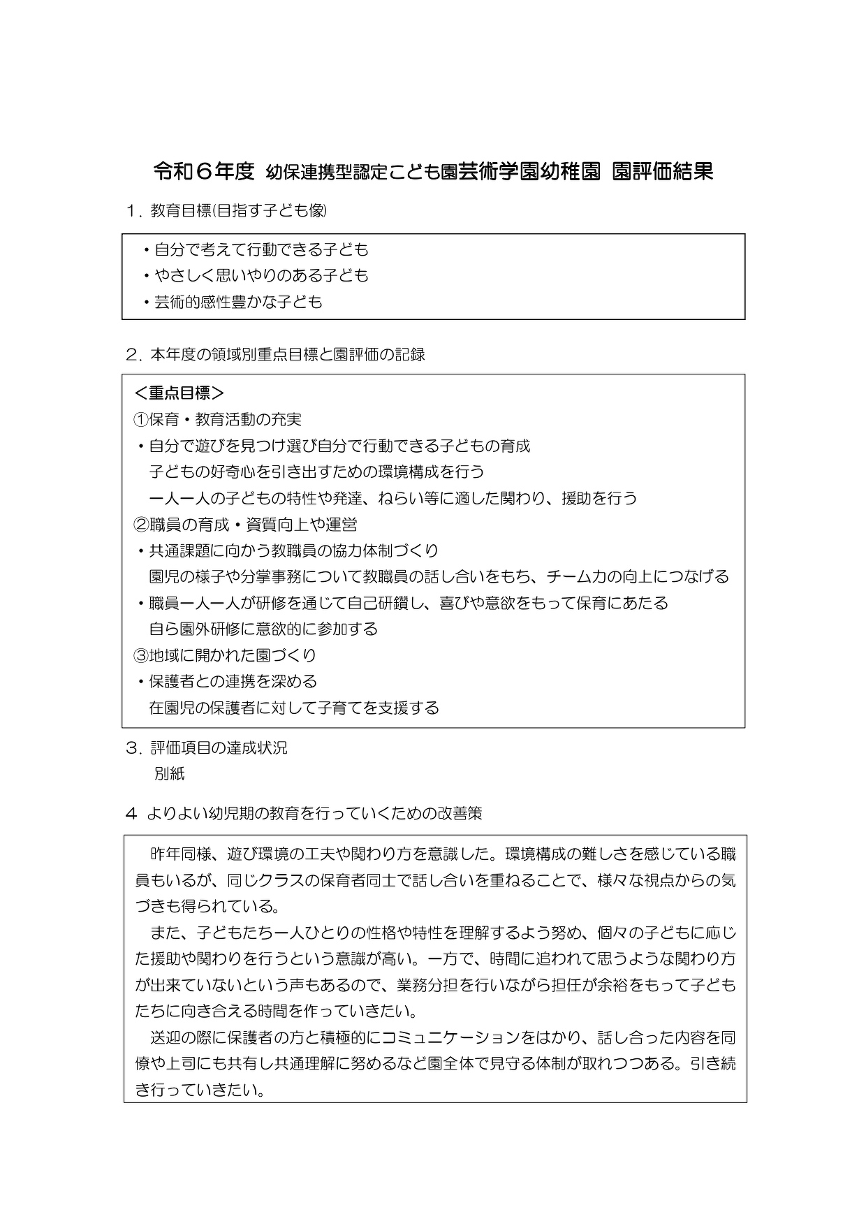 幼保連携型認定こども園 芸術学園幼稚園では、教育・保育活動の更なる質の向上を図ることを目的として、自己評価を実施しましたので、その結果を公表します。
